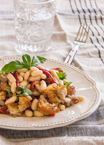 En un bol colocar las judías, pimientos cortados en tiras, alcaparras, pan troceado, hojas de albahaca y el pollo también en trocitos. Mezclar bien y agregar la vinagreta.