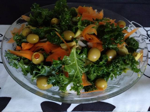 Así que la preparé muy pronto, enjuague el kale y le puse el aceite de oliva para que la hoja se pusiera más blandita y después le añadí los demás ingredientes, riquísima.