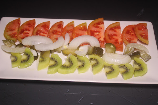 Colocamos ordenaditas las lonchas de tomate en un lado de la bandeja y en el otro lado de ella el kiwi.