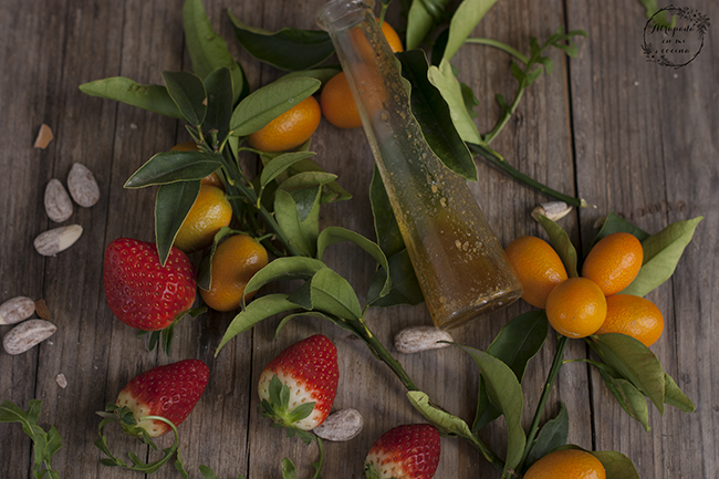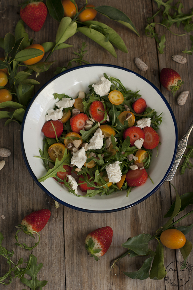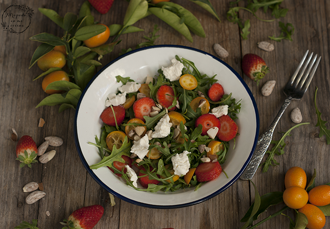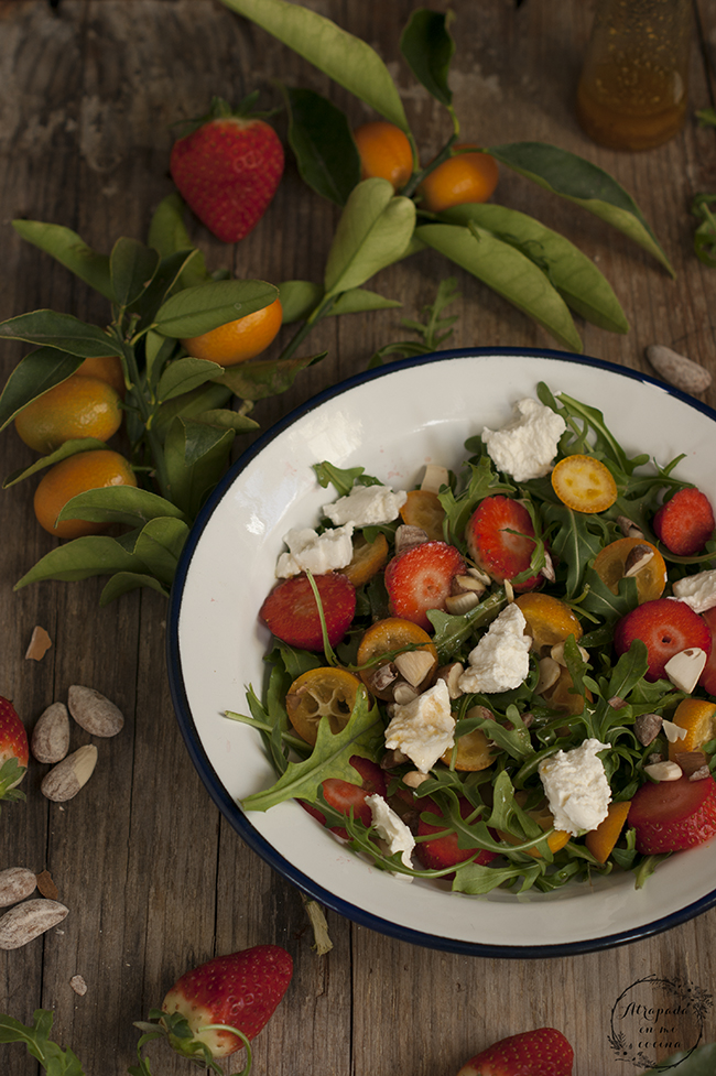 Lavamos y secamos la rúcula. Disponemos sobre el plato de servicio. Lavamos la fruta, tanto los kumquats como las fresas o fresones y cortamos ambos en rodajas. Añadimos al plato. Al igual que las almendras troceadas y el queso.