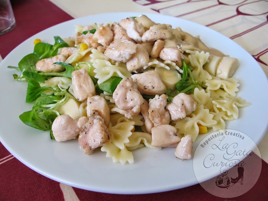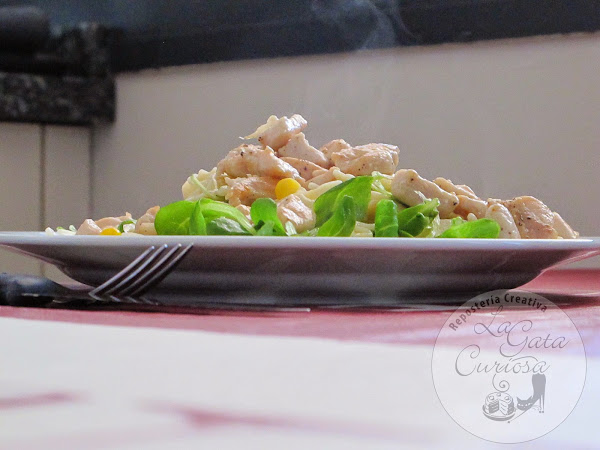 A mi marido le gusta comprar pollos ?hermosos?, somos tres y el gato, con lo que un pollo nos da bastante de si, con las alas y los contramuslos hicimos patatas y carne (el guiso se hace igual pero poniendo el pollo frito en vez de las albóndigas de bacalao) con una de las pechugas preparamos esta ensalada que os presento hoy, y con los muslos y la otra pechuga preparé un arroz, lamentablemente no le hice fotos, lo tendré que repetir porque era una delicia.