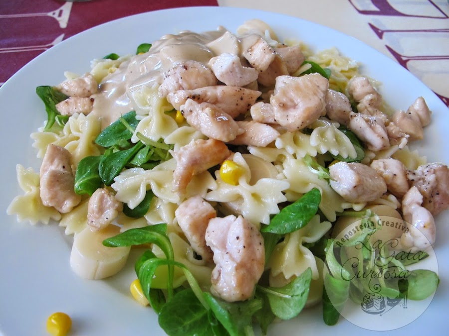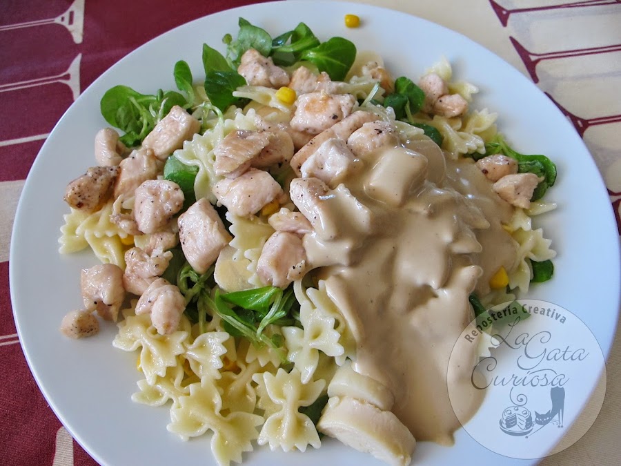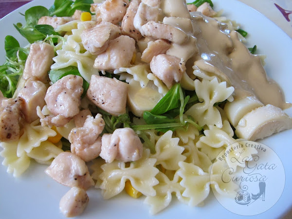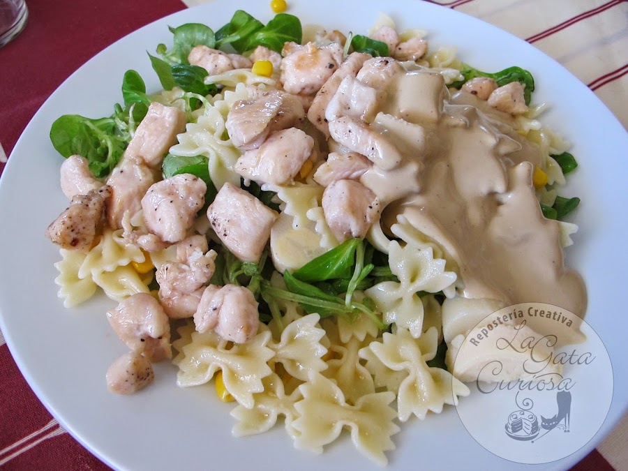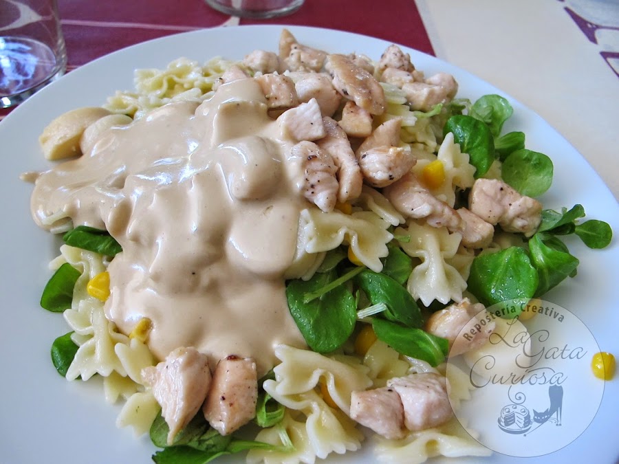 Servimos en el plato la ensalada de pasta con el pollo encima y un poco de salsa Cesar en un lado.