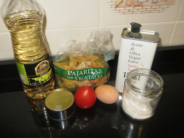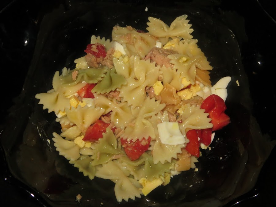Hervimos la pasta en abundante agua con sal y cuando está lista la escurrimos y la refrescamos con agua fría. La pasamos a un bol apto para ensalada y le añadimos la lata de atún, los tomates cherry en trozos y el huevo duro. Se le añade la vinagreta y se acompaña con mayonesa light.
