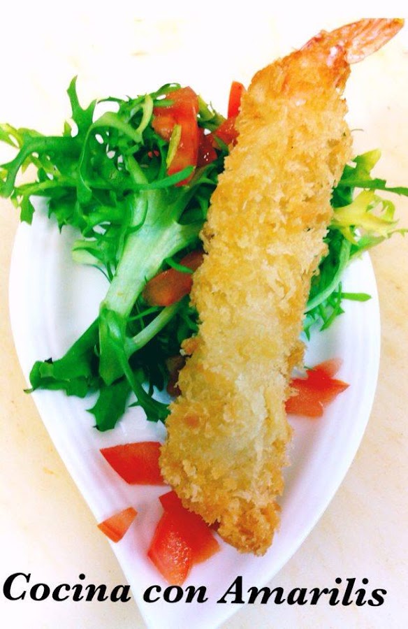 En esta ensalada vamos a utiliza unos Langostinos Panko que son muy orientales por su rebosado, que esta hecho con un pan muy especial, que tiene forma de escamas, se venden en las tiendas orientales, aunque también los venden los langostinos ya rebosados con el panko (vienen congelados). Asi es mucho mas cómodo, pero si los preparas en casa en mucho mejor de sabor.