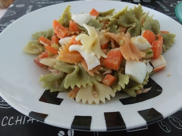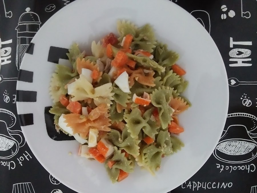 Picamos los huevos, las zanahorias, el tomate, el pepino y los palitos y los añadamos a la pasta.