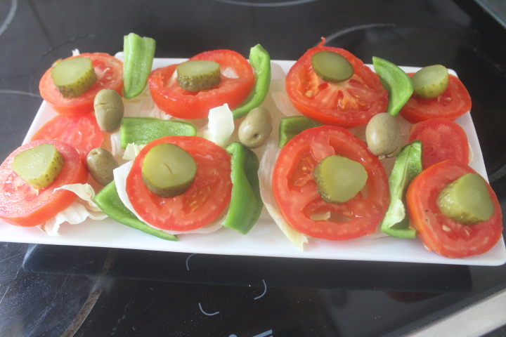 Sobre cada rodaja de tomate colocamos una rodaja de pepinillo en vinagre.