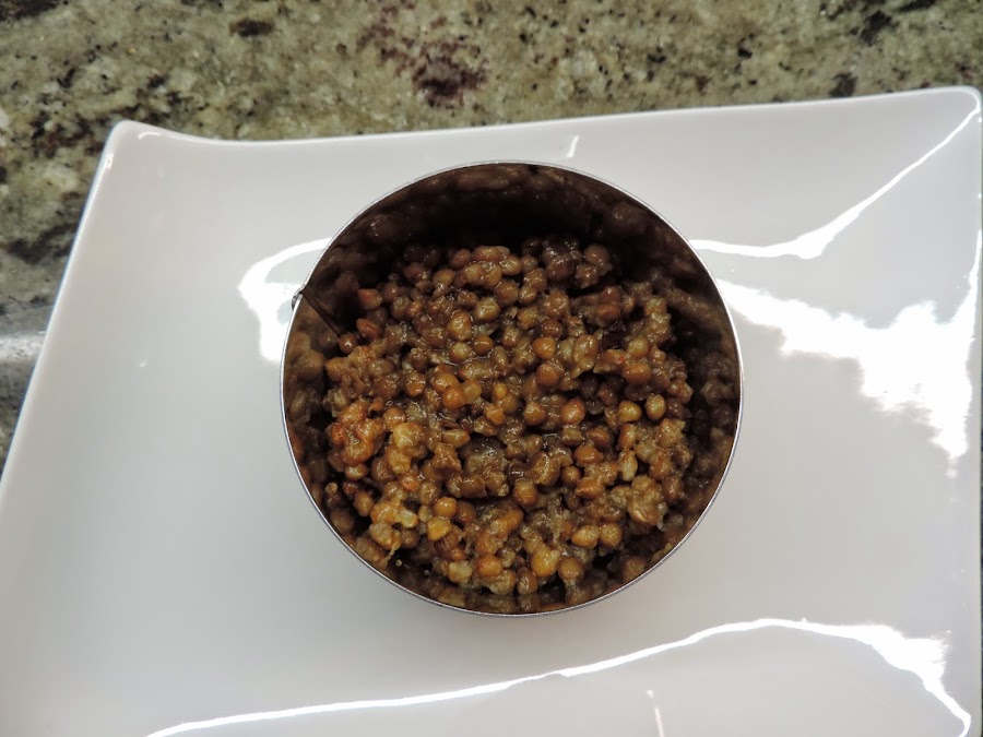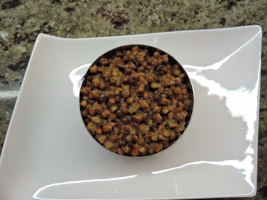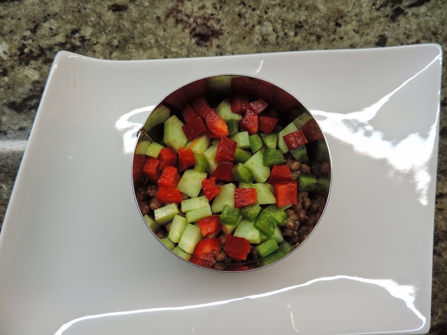 Montamos la ensalada con la ayuda de un aro de emplatar, ponemos una capa de lentejas.