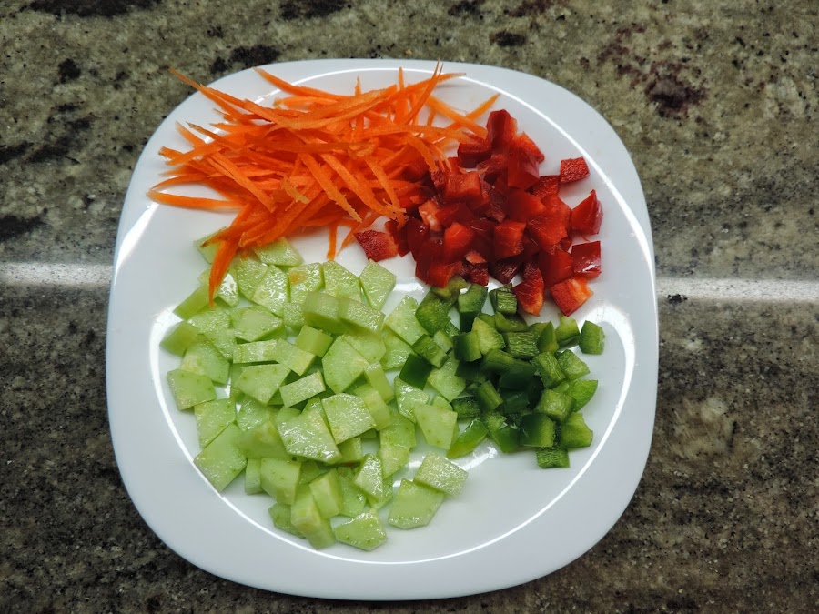 Cortamos en trozos pequeños el pimiento y el alpicoz, la zanahoria con ayuda de un pelador la haremos en juliana.