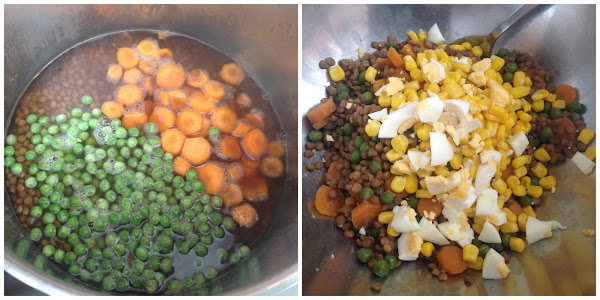 Ponemos a hervir en abundante agua con sal las lentejas durante 15 minutos. Luego añadimos las zanahorias peladas y troceadas y los guisantes congelados. Dejamos cocinar 15 minutos más. Retiramos del fuego, escurrimos el agua y dejamos enfriar en un bol.