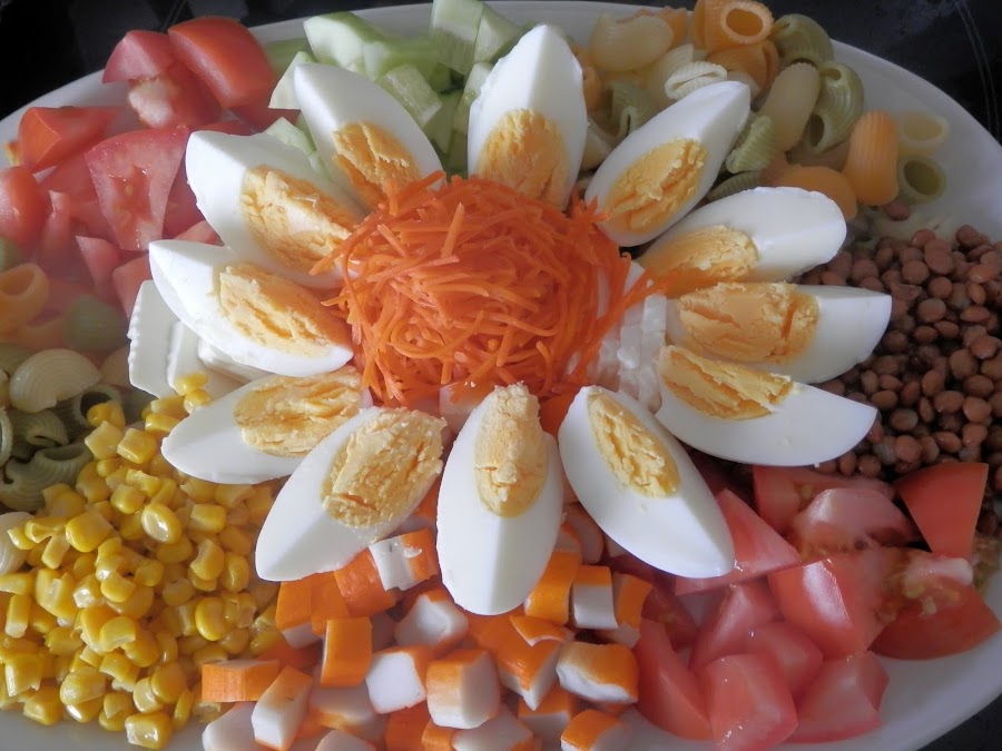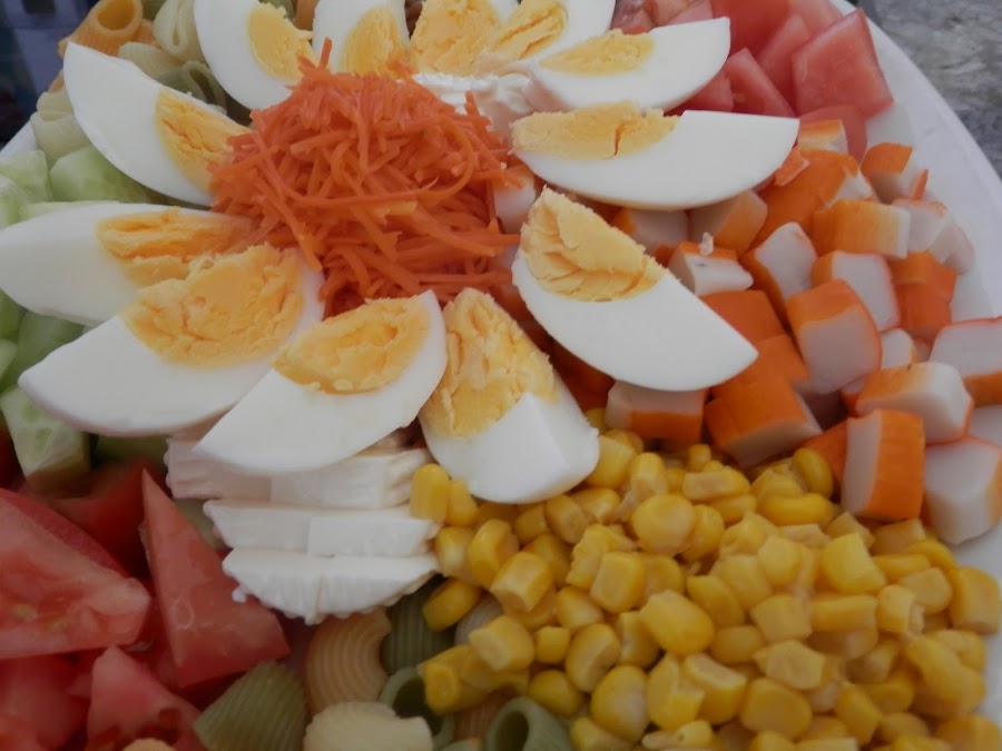 En la fuente donde la serviremos, iremos colocando pequeños montoncitos de las verduras cortadas. Pondremos el pepino, el tomate y el maíz.
