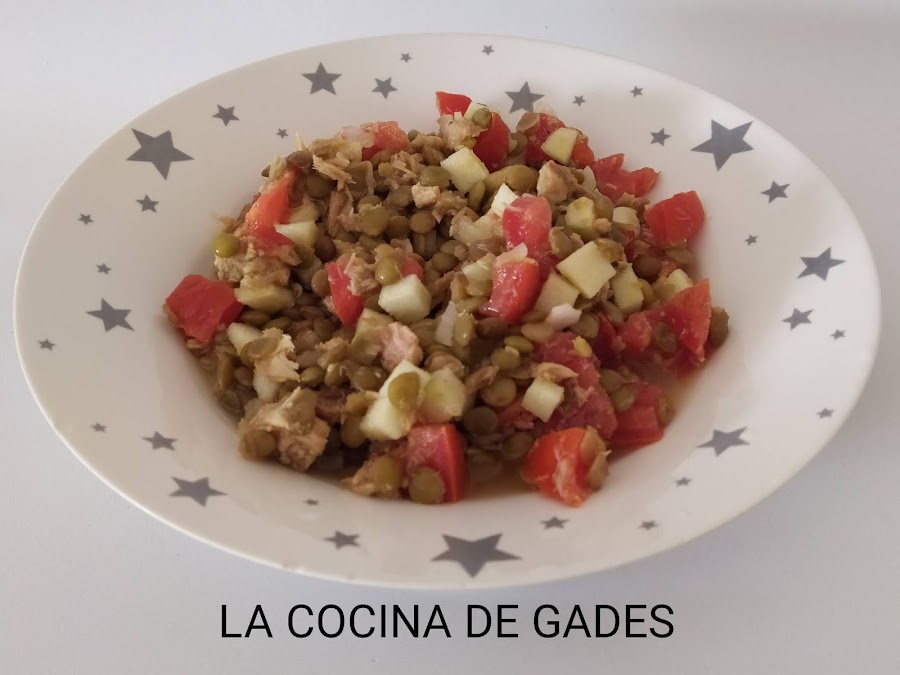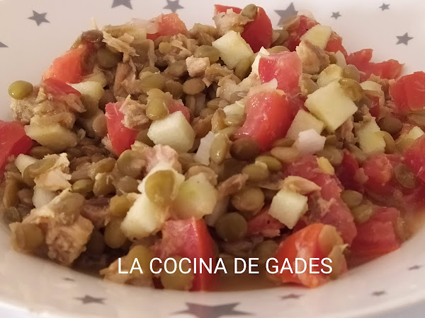 En un bol añadimos las lentejas, la manzana, cebolla, tomate y el atún desmigado.