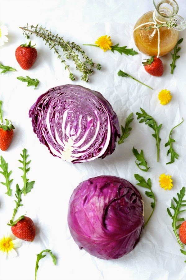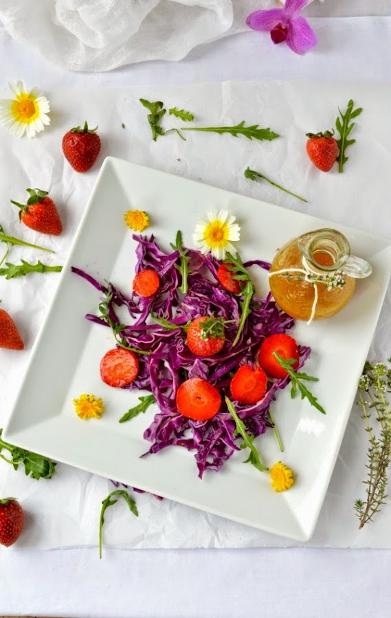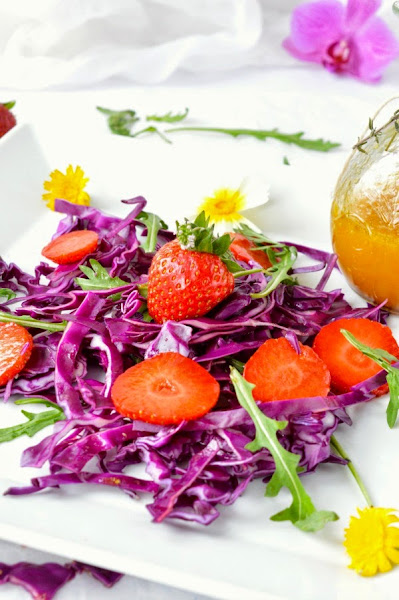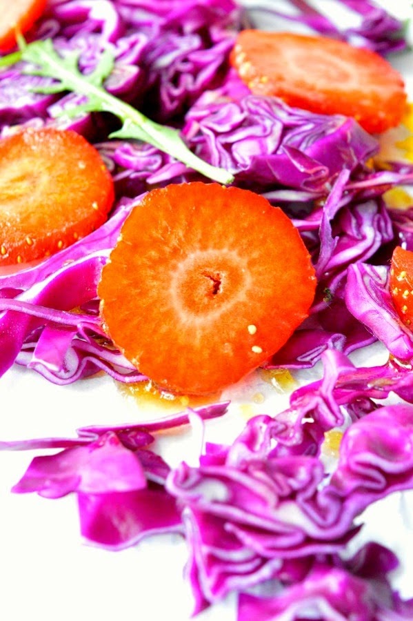 PURPLE CABBAGE, STRAWBERRIES, AND ARUGULA SALAD WITH ORANGE VINAIGRETTE