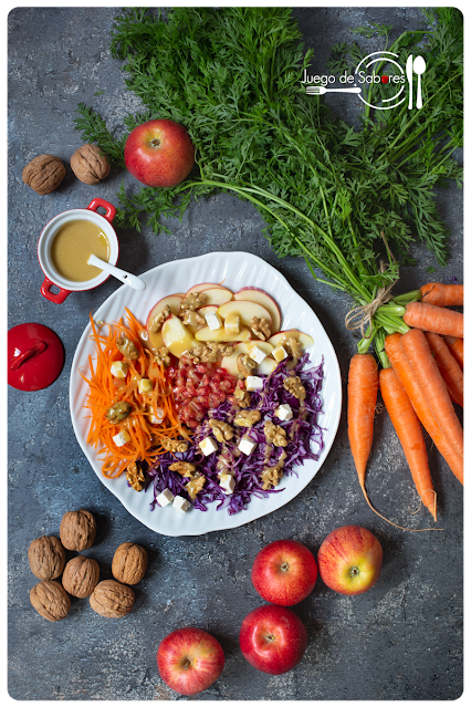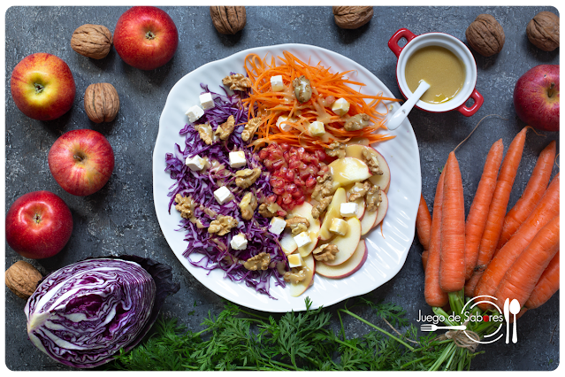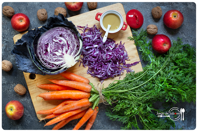 El color de esta col lombarda me volvió loca cuando la vi en el marcado mensual que los hortelanos ponen en la Plaza Mayor de Palencia. Fue un amor a primera vista y me dije que de aquella preciosidad tenía que salir un plato espléndido. Dicho y hecho. Compré los demás ingredientes allí mismo porque me gusta consumir productos de temporada y de proximidad y así completé la paleta de colores. Una vez en la cocina me puse manos a la obra para montar una ensalada que, básicamente, fuese agradable a la vista porque la calidad del producto estaba garantizada.