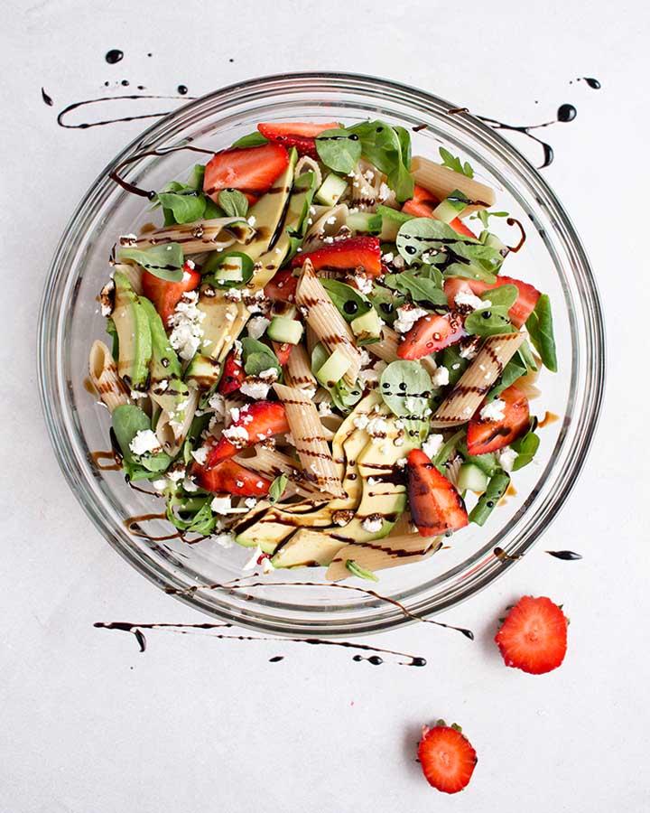 En este ensalada vamos a jugar con los tonos verdes del aguacate, de la rúcula y del pepino que contrastan con el rojo intenso de las fresas. Queda muy vistosa y a la vez nos ofrece un plato de pasta con verdura y fruta muy completo.