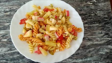 Ponemos al fuego una cazuela con los tres litros de agua y un puñado de sal gruesa para que cueza, cuando empiece a hervir añadimos los macarrones y los dejamos que se vayan haciendo a fuego lento hasta que estén en su punto, cundo ya están cocidos los echamos en un escurridor y los ponemos debajo del grifo del agua fría para que queden sueltos y tersos. Mientras se enfrían un poco vamos picando la piña, el tomate, la manzana, el queso tierno, la carne de cangrejo, las aceitunas sin hueso y lo mezclamos todo con los macarrones en una cazuela amplía. A continuación servimos en los platos y los aliñamos con aceite de oliva y vinagre de manzana. Y listo!!!
