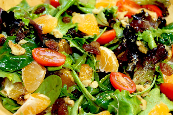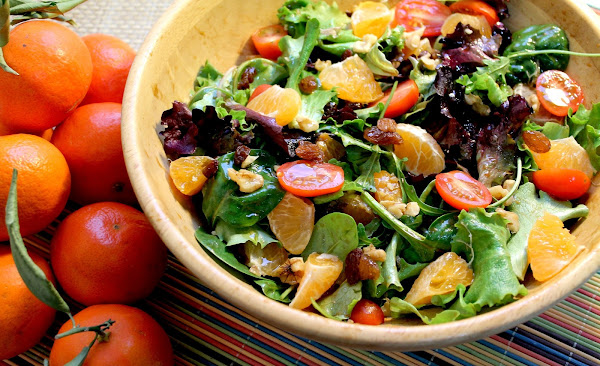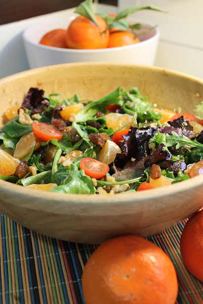El elemento fundamental son los gajos de mandarinas cortados por la mitad y un delicioso y dulce tomate cherry pera, también cortados en mitades. Otro elemento importante son los frutos secos, nueces y pasas.