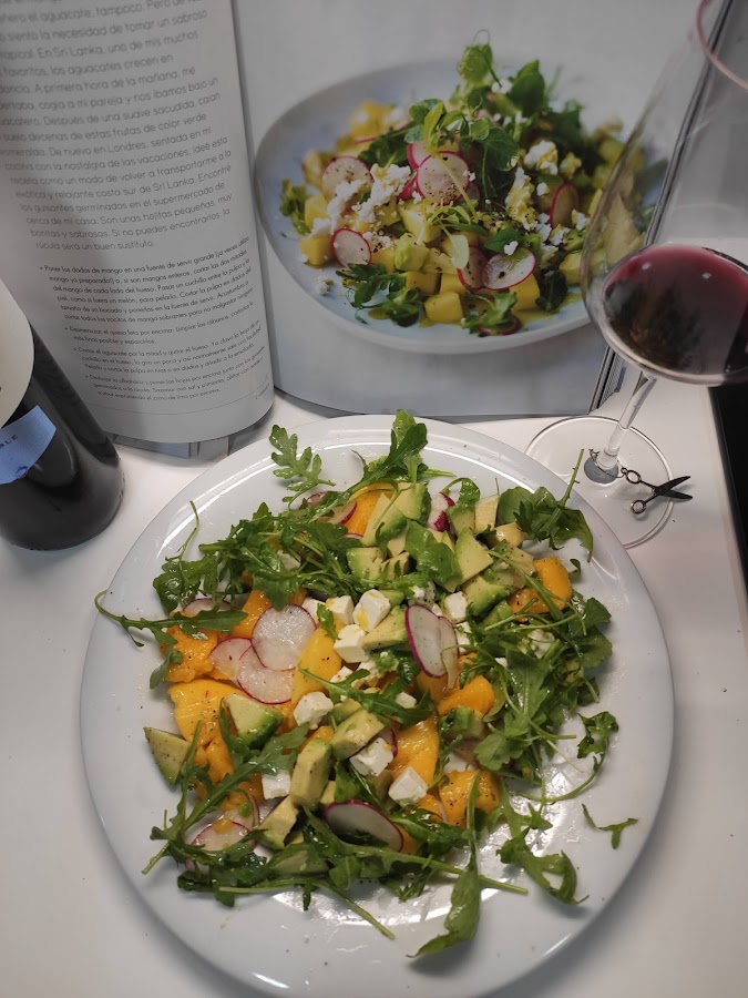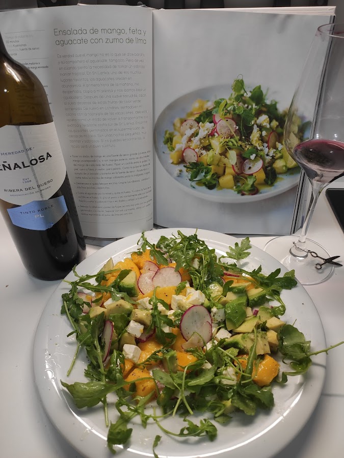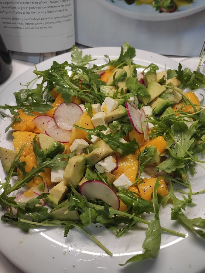 Deshojamos la albahaca y ponemos las hojas por encima junto con la rúcula. Sazonamos con sal y pimienta, aliñamos con aceite y exprimimos el zumo de lima por encima.