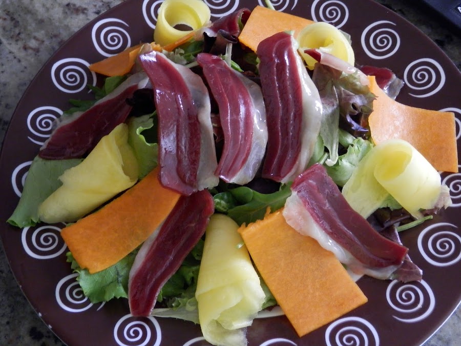 Ahora pondremos en los huecos, lonchitas del jamón de pato.