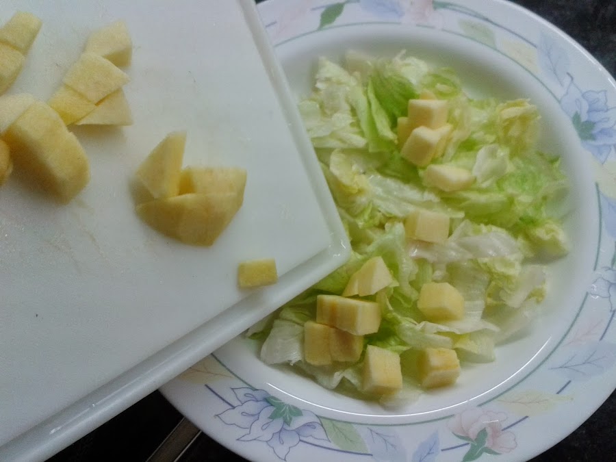 3.- Hacemos dados con la manzana y añadimos a la lechuga.