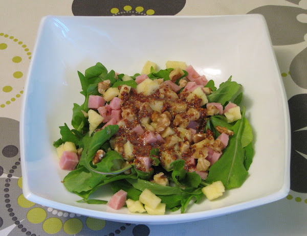 - Corta en cuadraditos el jamón york y la manzana, tras lavarla y pelarla, y ponla sobre la rúcula.