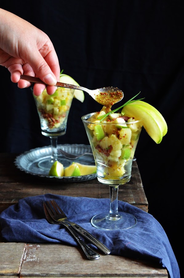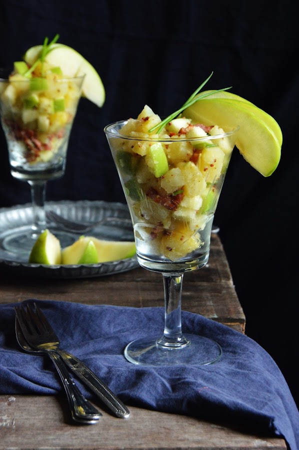 Mezclamos las patatas con el bacon, cebollino y la manzana, aliñamos con la vinagreta y la servimos en las copas adornadas con las láminas de manzana y unas ramitas de cebollino.