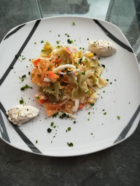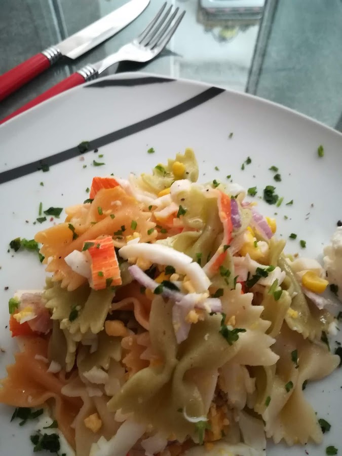 Una vez cocida, siguiendo las instrucciones del fabricante, escurrir, refrescar y agregar al bol donde tenemos la cebolla y los palitos fileteados, antes retiramos el huevo, lo refrescamos con agua fría y quitamos la cáscara.
