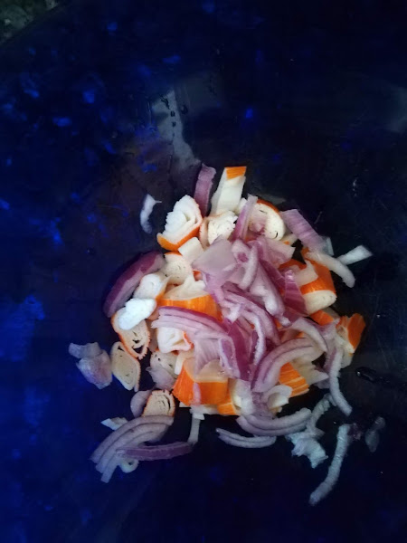 En un bol filetear la cebolla bien fina y los palitos de cangrejo.