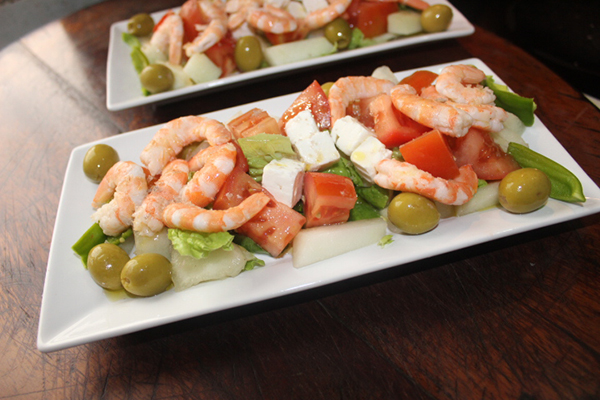 Pelamos las gambas una vez descongeladas, colocándolas sobre la ensalada.