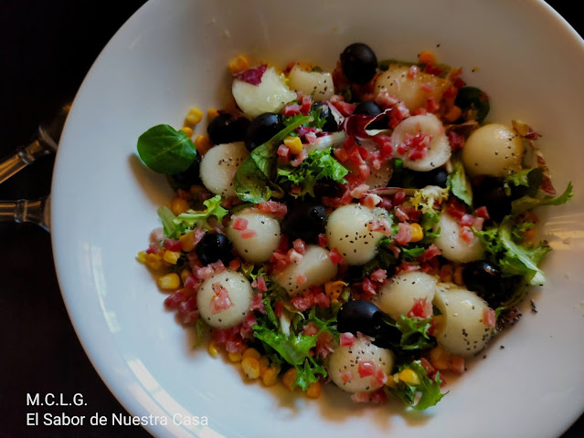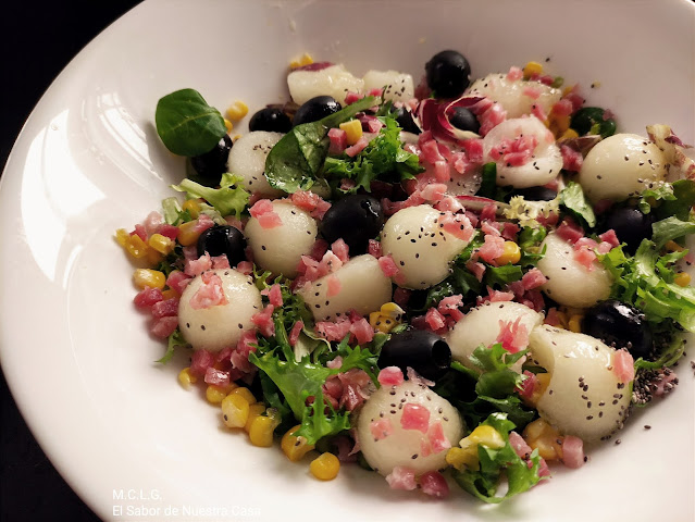 Pon las lechugas en una ensaladera y añade las bolas de melón, los taquitos de jamón, el maíz escurrido y las aceitunas.