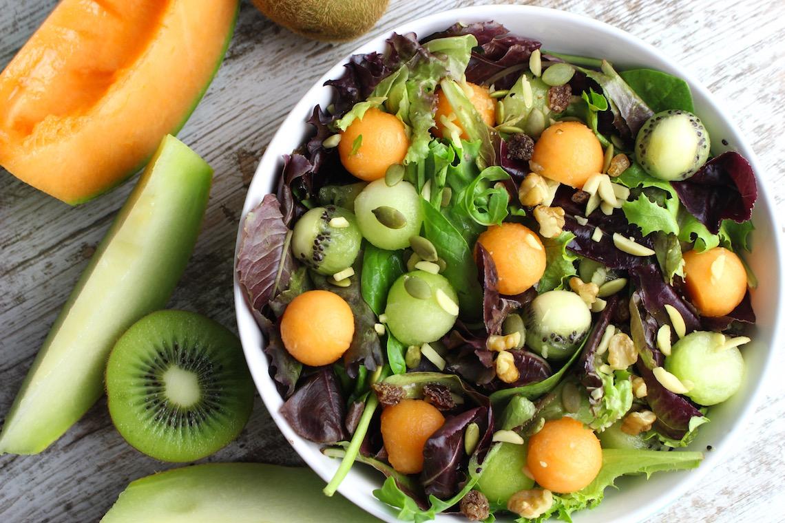 Refrescante ensalada de brotes tiernos con bolitas de melón galia y cantaloup, kiwi y semillas