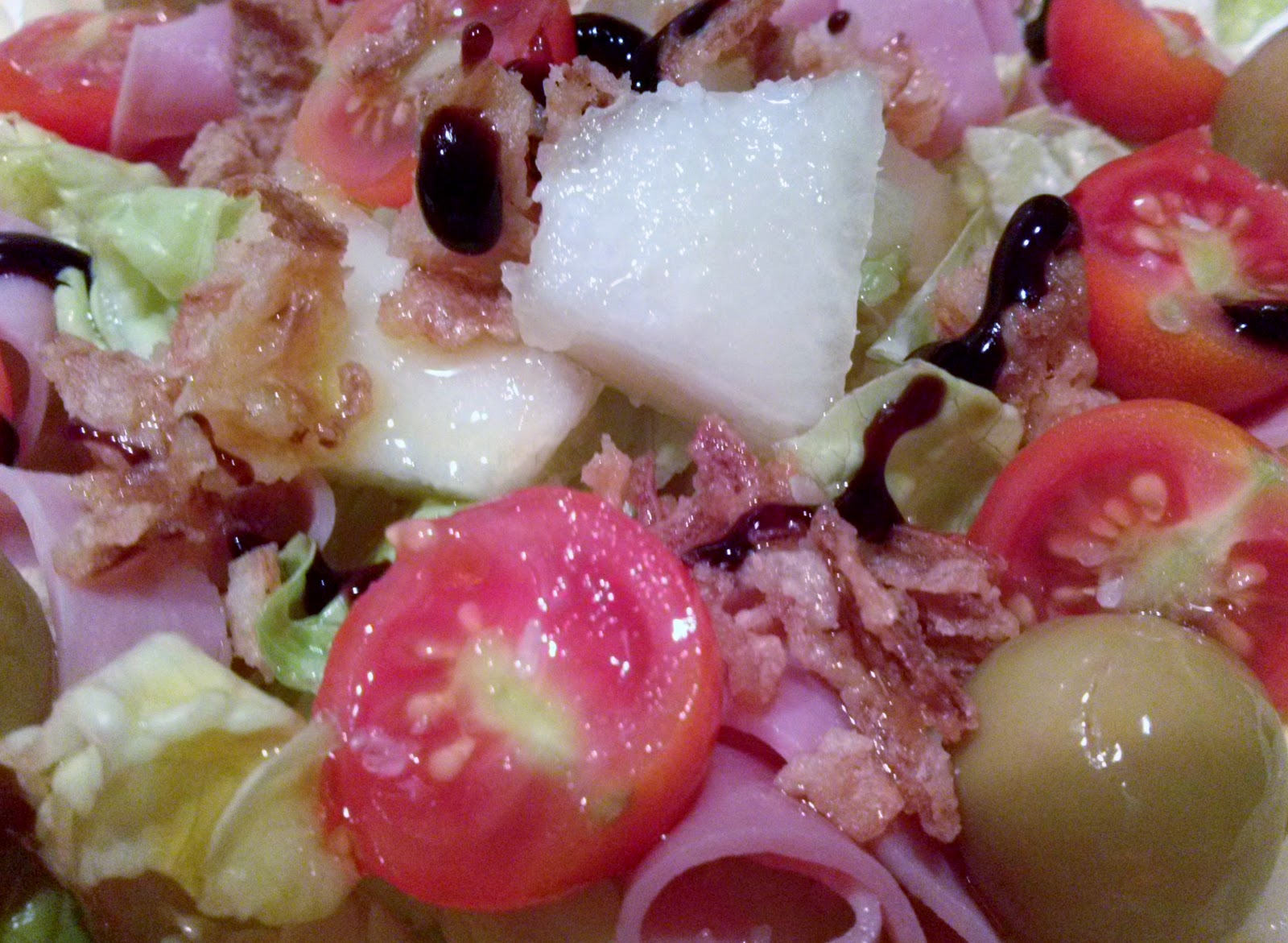 Pon todo esto y los demás ingredientes en una ensaladera , aliña con sal, aceite y la crema de vinagre de frambuesa en el momento de servir para que la lechuga se mantenga fresca.