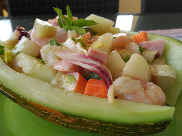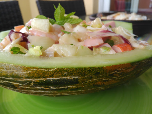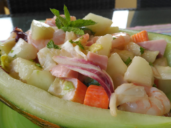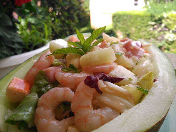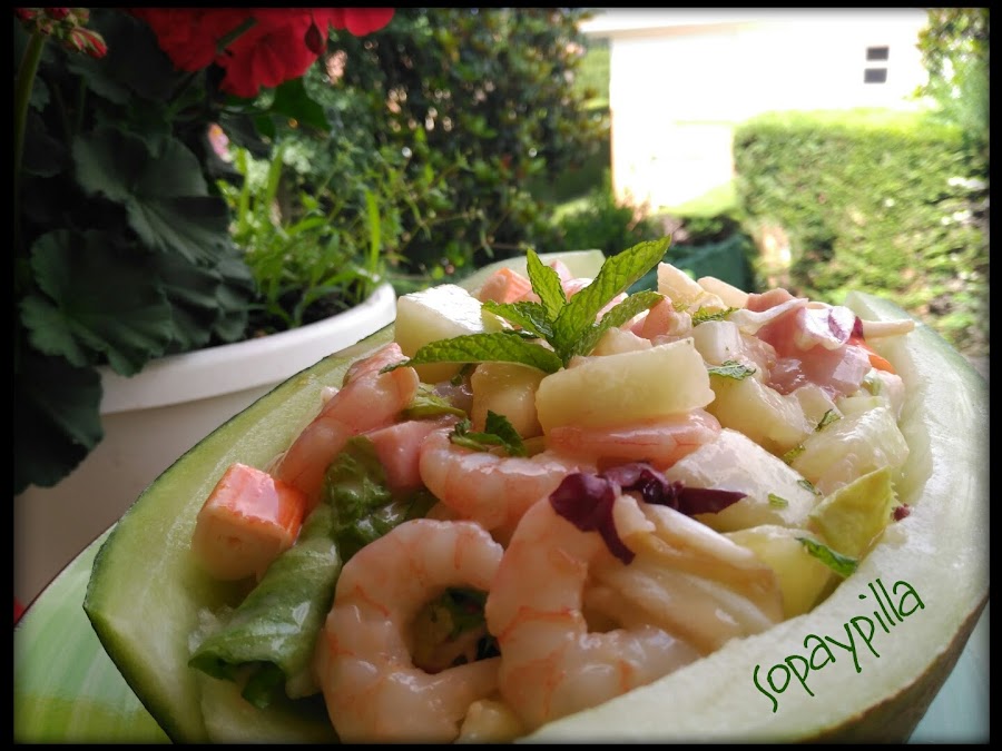 Os propongo una ensalada muy fresca, ligera y muy muy rica, además se hace en un momento, y al servirla en el melón os va a vestir la mesa de cualquier celebración.
