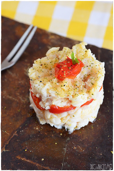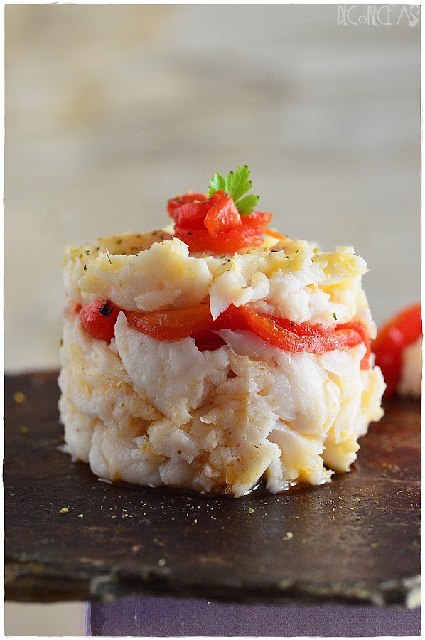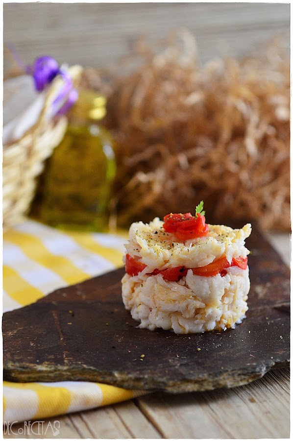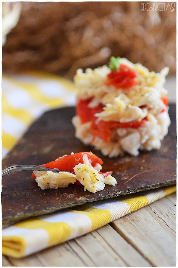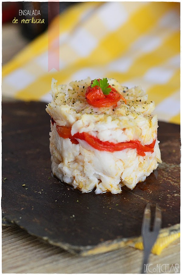 Cocí unos lomos de merluza, que cuando estaban fríos, desmenucé y salpimente. Emplaté, poniendo una cantidad en el fondo de un aro, después, un poco de este aceite, unas tiras de pimiento del piquillo asado, y repetimos la operación, merluza, aceite y un poco más de pimiento para culminar