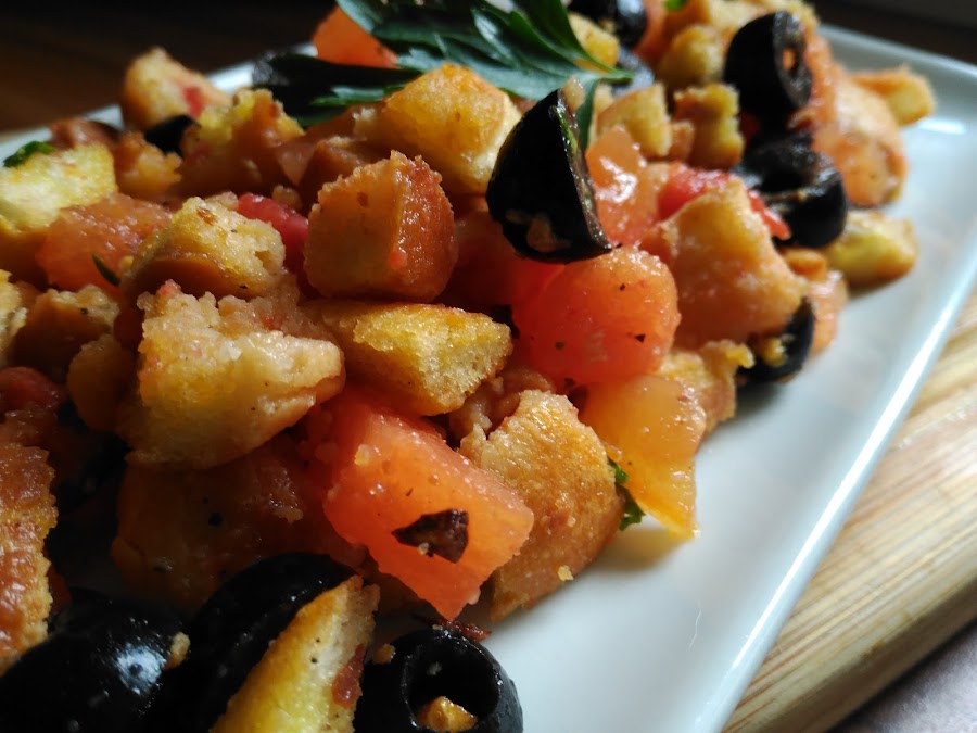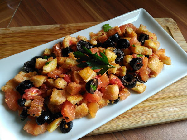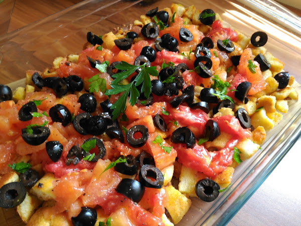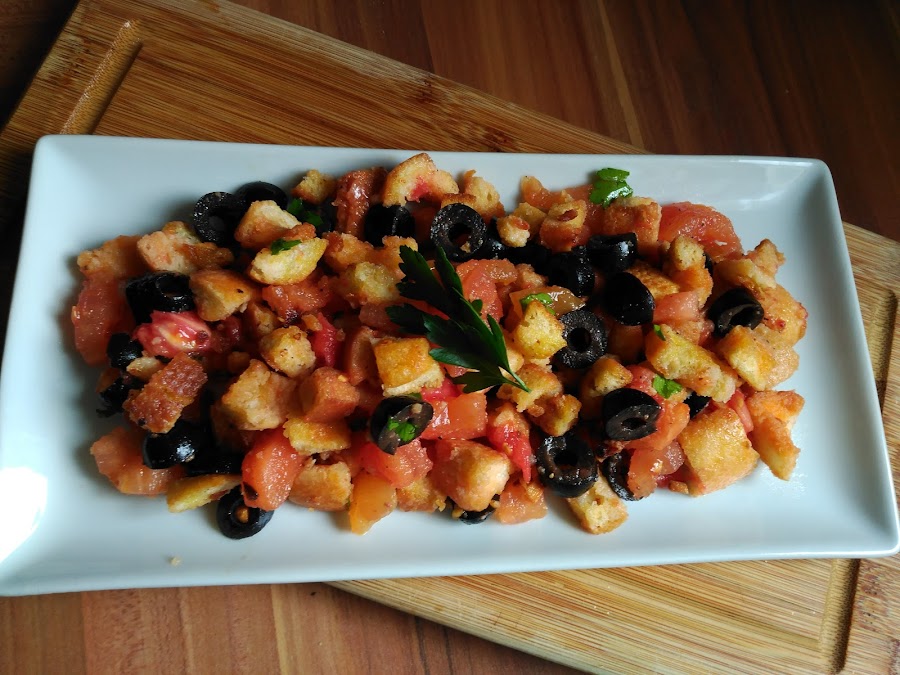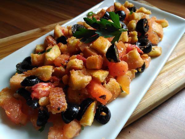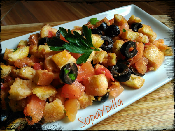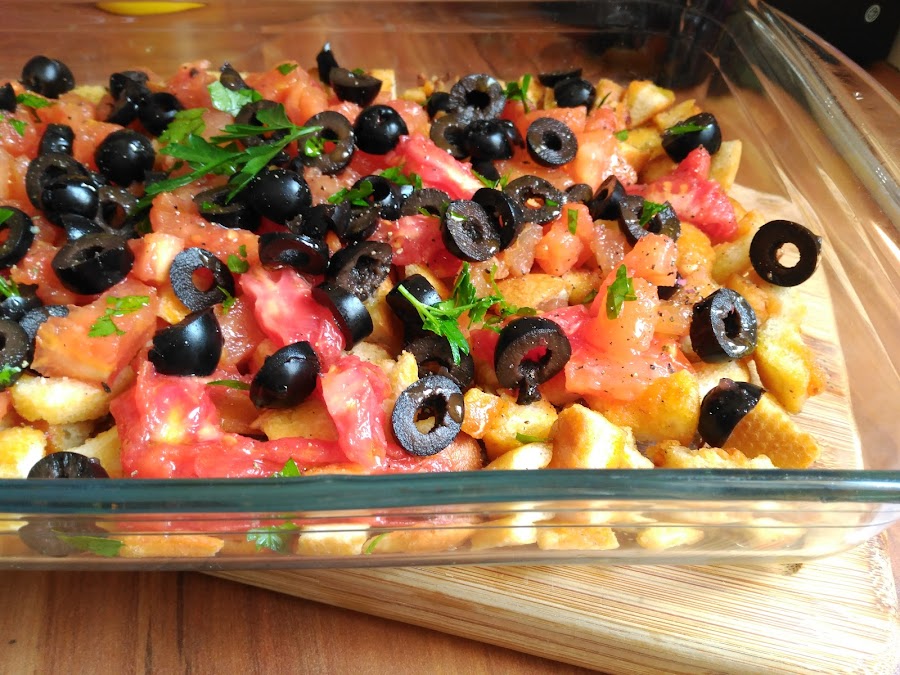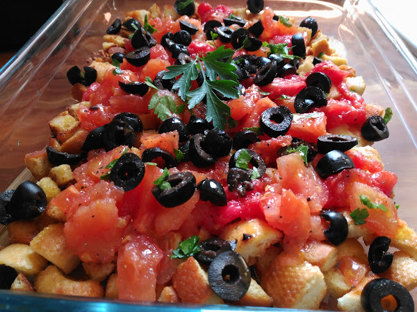 - En una bandeja grande repartimos el pan, ponemos encima el tomate reservado, las olivas troceadas, mezclar bien y espolvorear el perejil fresco picado.