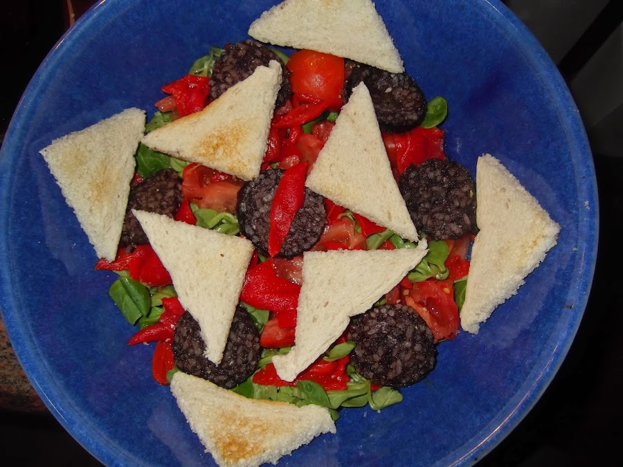 Pasados unos 20 minutos veréis como la morcilla ha soltado parte de su grasa y ya está crujiente para añadirla a la ensalada. Mientras la morcilla ha estado en el horno hemos ido preparando el resto de los ingredientes. Hemos lavado los canónigos y los hemos colocado en la base de la ensalada, hemos pelado y cortado los tomates y hemos añadido en trozos los pimientos del piquillo sin pepitas. Asimismo, hemos tostado el pan de sandwich para adornar la ensalada.