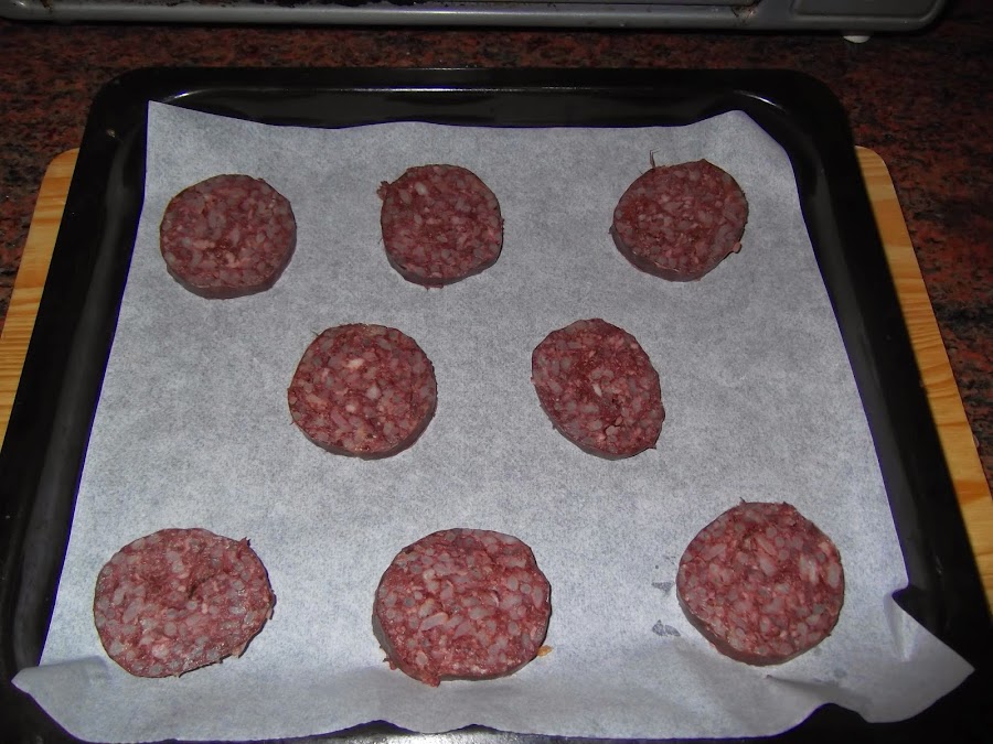 Lo primero que vamos a realizar es la morcilla que es lo único laborioso. Colocáis papel de horno en la bandeja para horno y lo precalentáis a 180º. Cortáis la morcilla en rodajas finas, pero que tengan un poco de consistencia, uno o dos centímetros, las colocáis encima del papel y las metéis al horno.