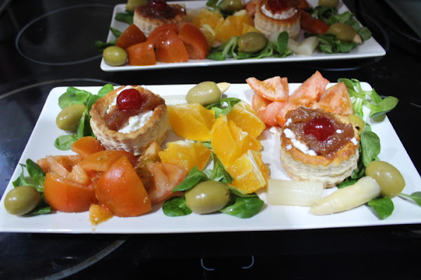 Pelamos y troceamos a daditos la naranja, repartiéndola entre ambas bandejitas y colocándola entre ambos volovanes.