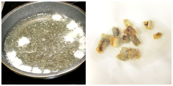 Para ello la cortamos en tiras estrechas, en una sartén ponemos abundante aceite para freír, a fuego fuerte, cuando esté muy caliente ponemos la piel hasta que se dore. Una vez doradas las sacamos y las escurrimos en papel absorvente. Reservamos.