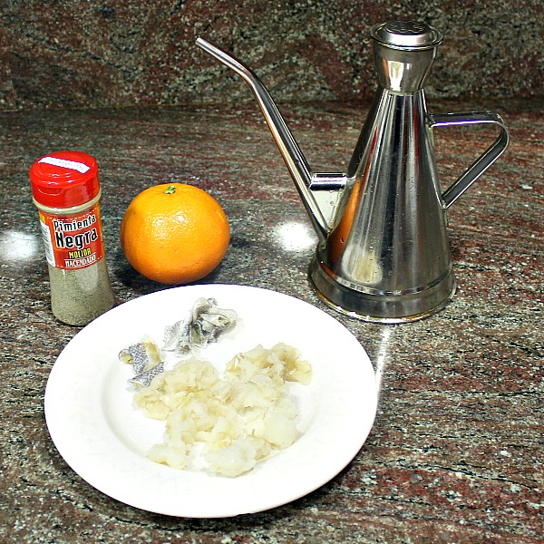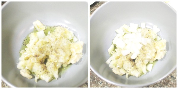 La carne la partimos a trozos pequeños y la mezclamos con la cebolleta partida pequeña. Lo aliñaremos todo con aceite, sal y pimienta negra al gusto. Reservamos.