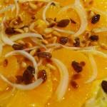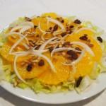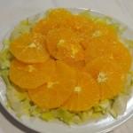 Sobre la lechuga vamos poniendo la naranja cortada en rodajas no demasiado finas y por encima de la naranja unas tiras de cebolla blanca en juliana.
