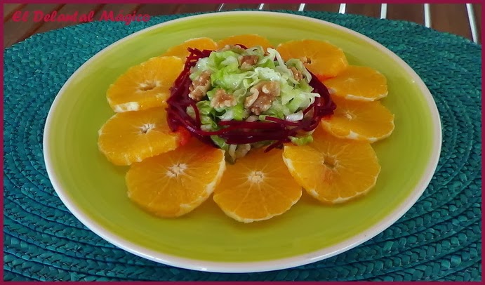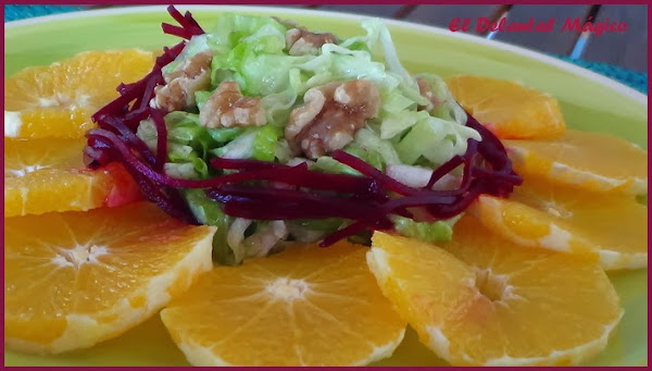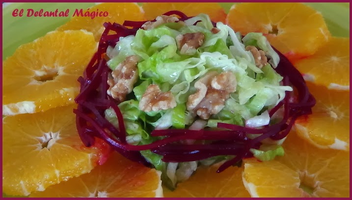 Pelamos las naranjas, las cortamos en rodajas finas y cubrimos con ellas nuestro plato de presentación. En el centro ponemos la lechuga, en mi caso cortada en juliana, y al rededor ponemos la remolacha. Por último, encima de la lechuga ponemos unas cuantas nueces troceadas y aliñamos con aceite de oliva y sal.
