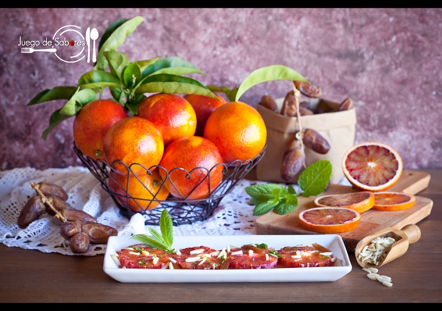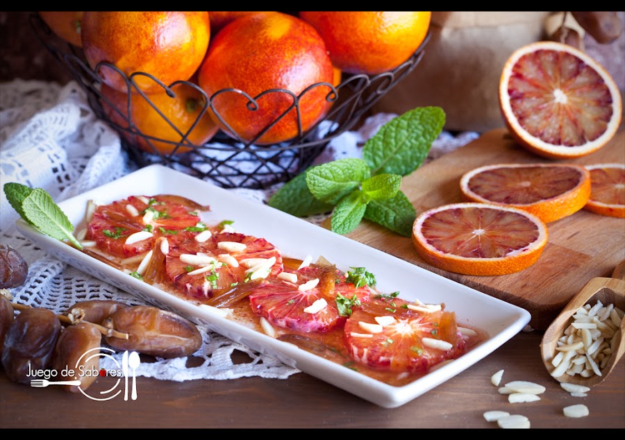 La que os presentamos es una ensalada de invierno porque es en esa época del año cuando las naranjas sanguinas base del plato- están en su mejor momento. También es una ensalada que por sus ingredientes podríamos calificar de moruna. Que por qué decimos esto. Pues porque a parte de esas naranjas de un rojo intenso lleva dátiles, hierbabuena, canela, bastoncitos de almendra y agua de azahar. Todo este conjunto de olores y sabores nos traslada irremediablemente a los zocos marroquíes y así nos lo quisieron hacer sentir y vivir nuestros buenos amigos Cobi y Albert con quienes compartimos este primer plato, seguido de un memorable y delicioso cus-cus.