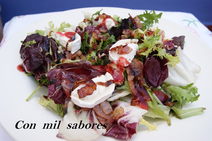 Ponemos la ensalada en una fuente, le esparcimos el beicom sofrito por encima, el que se cabra en rodajas, una pizca e sal, el vinagre balsámico , un poco de mermelada de fresa y por último el beicom junto con el aceite y la grasa de sofreírlo.