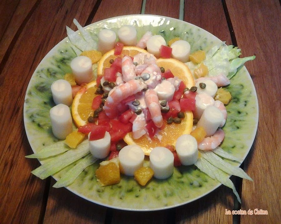 Pelar las gambas. Partir una naranja en medias lunas y colocarlas en el fondo de la fuente donde vayamos a servir la ensalada.