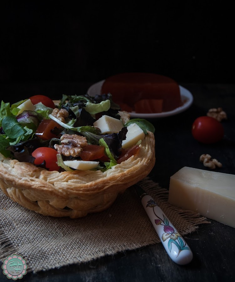 Esta tendencia a engordar es algo que ya tengo muy asumido, pero cuando eres adolescente y la hermana, con la que te llevas quince meses, es un pivón, es bastante molesto, la verdad... Actualmente, intento cuidarme y no pasarme entre semana, eso sí, comiendo de todo. Cuando llega el fin de semana, me doy algún capricho, ¿por qué no? Eso sí, me he acostumbrado a las raciones pequeñas... Os puedo asegurar que todo lo que publico en el blog, lo he probado más de una vez, o sea que comer, como. De hecho, si os fijáis en el volumen de recetas dulces es bastante superior a la de saladas, o sea, no me estoy de nada... Pero para llegar a este punto, he tenido que aprender a comer y a cuidarme, y aquí es donde aparece la protagonista de hoy: la ensalada. Si bien viene acompañada por hojaldre, queso y membrillo, os aseguro que es sana, sana.