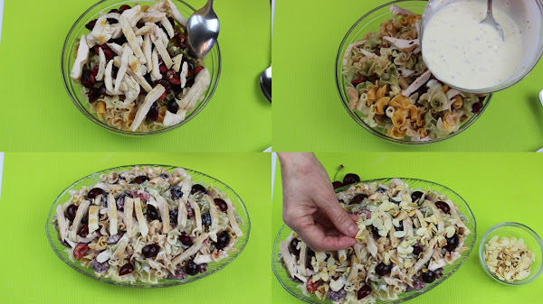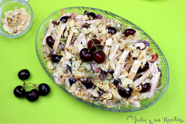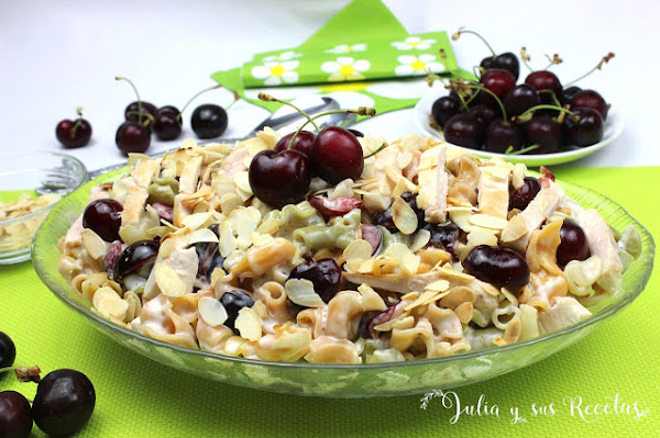 Ponemos en un bol la pasta, añadimos el pollo, el apio y las cerezas, añadimos la salsa y lo mezclamos todo muy bien.
