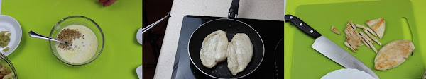 Hacemos los filetes de pollo a la plancha, los partimos en tiras.