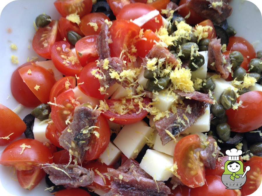 Mientras se hace la pasta vamos a preparar los demás ingredientes. Lavamos y cortamos los tomates cherry en cuatro y los ponemos en un bol grande. Añadimos las alcaparras, los filetes de anchoa escurridos y picados, las aceitunas cortadas en rodajitas, el queso provolone cortado en cubitos y la ralladura del limón. Mezclamos todo bien.