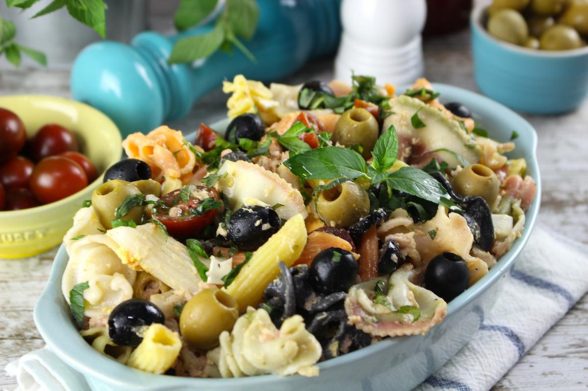 Refrescante y ligera ensalada de pasta fría con atún, cherry, huevo cocido, aceitunas, surimi, albahaca y menta.