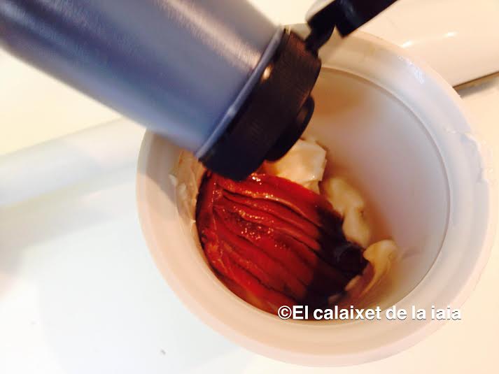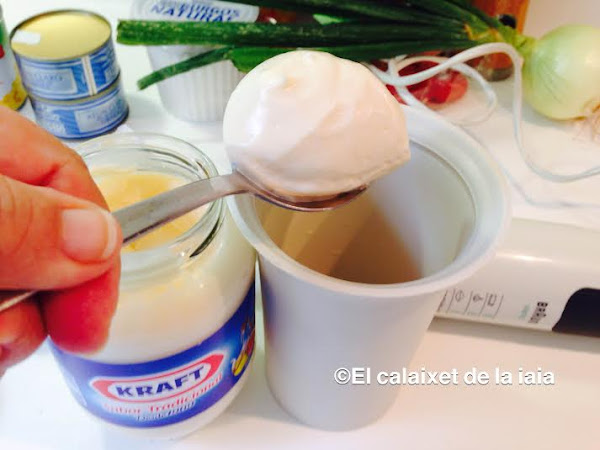 Prepararemos la salsa partiendo de una mayonesa, si no tenéis preparada, necesitáis un huevo entero y 200ml de aceite. Ponemos tres cucharadas soperas en un recipiente para batir y